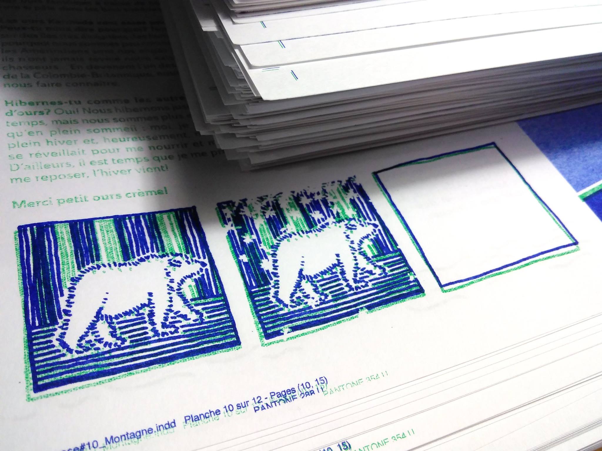 L’artiste Rectal Versal a eu la chance de participer à l’étape de l’impression au risographe (une couleur après l’autre…). Et j’adore sa façon d’illustrer un petit ours blanc dans la forêt enneigée.